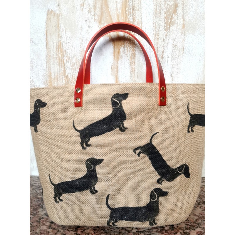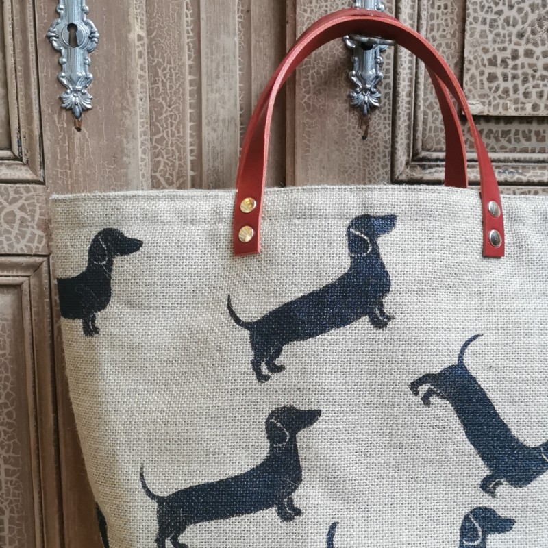 Avec son look unique et son format pratique, ce petit cabas en toile de jute décorés de teckels deviendra votre indispensable Panier. Chaque teckel est peint à la main dans nos ateliers normands, peinture textile fixée à chaud.